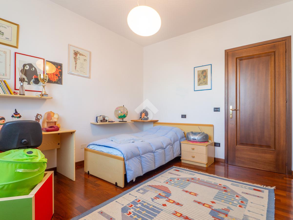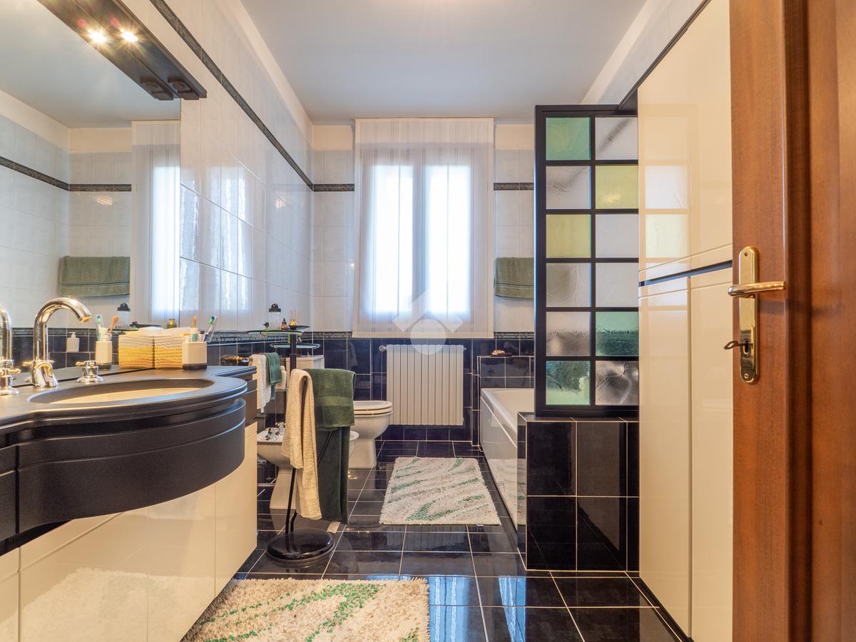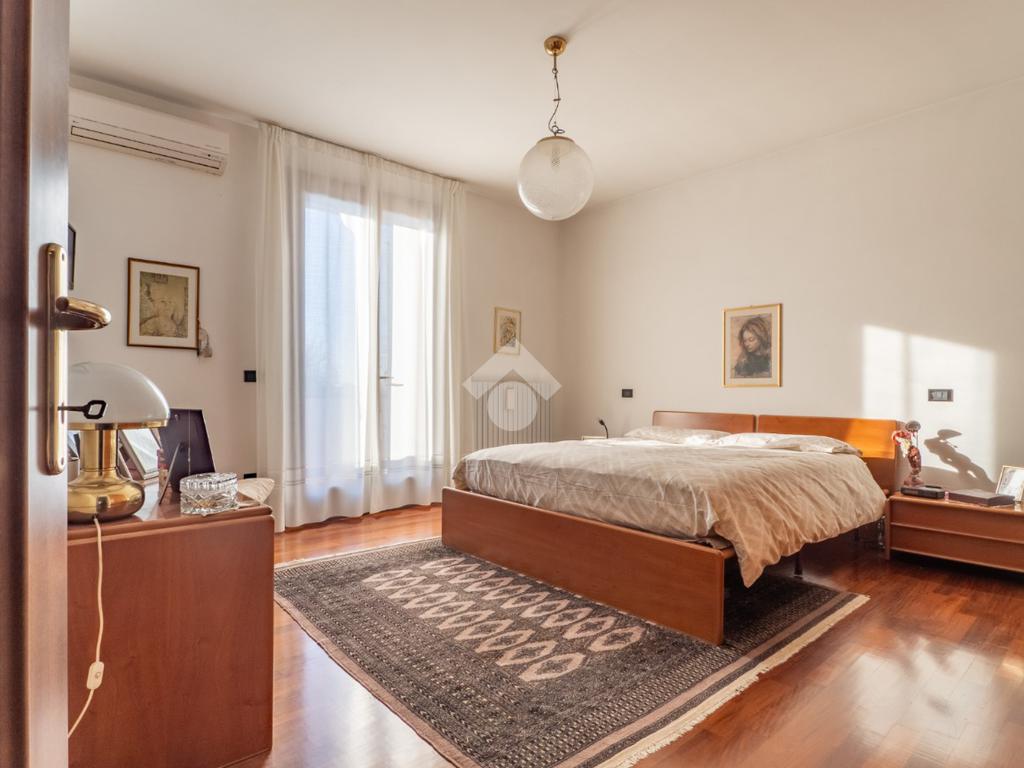 Prendendo le eleganti scale in legno, e separato da una raffinata porta a vetri che lascia filtrare la luce, si accede al grande disimpegno della zona notte, che ospita tre camere da letto e due grandi bagni finestrati: uno con doccia e uno con vasca idromassaggio. La camera padronale gode dell’accesso a un ampio balcone, mentre le altre due camere, oggi arredate come singole, offrono comunque metrature generose.