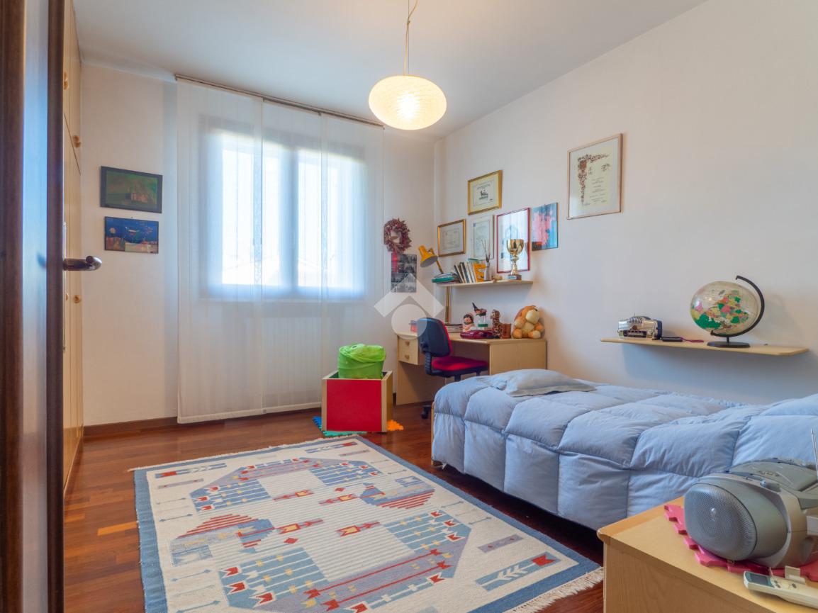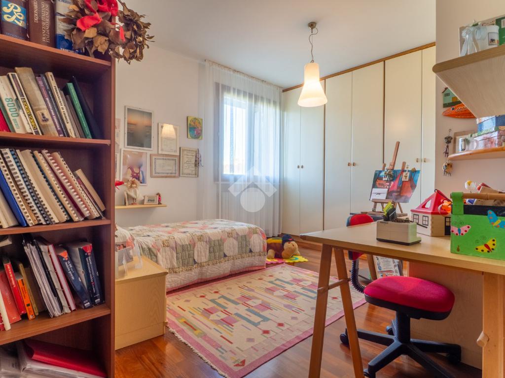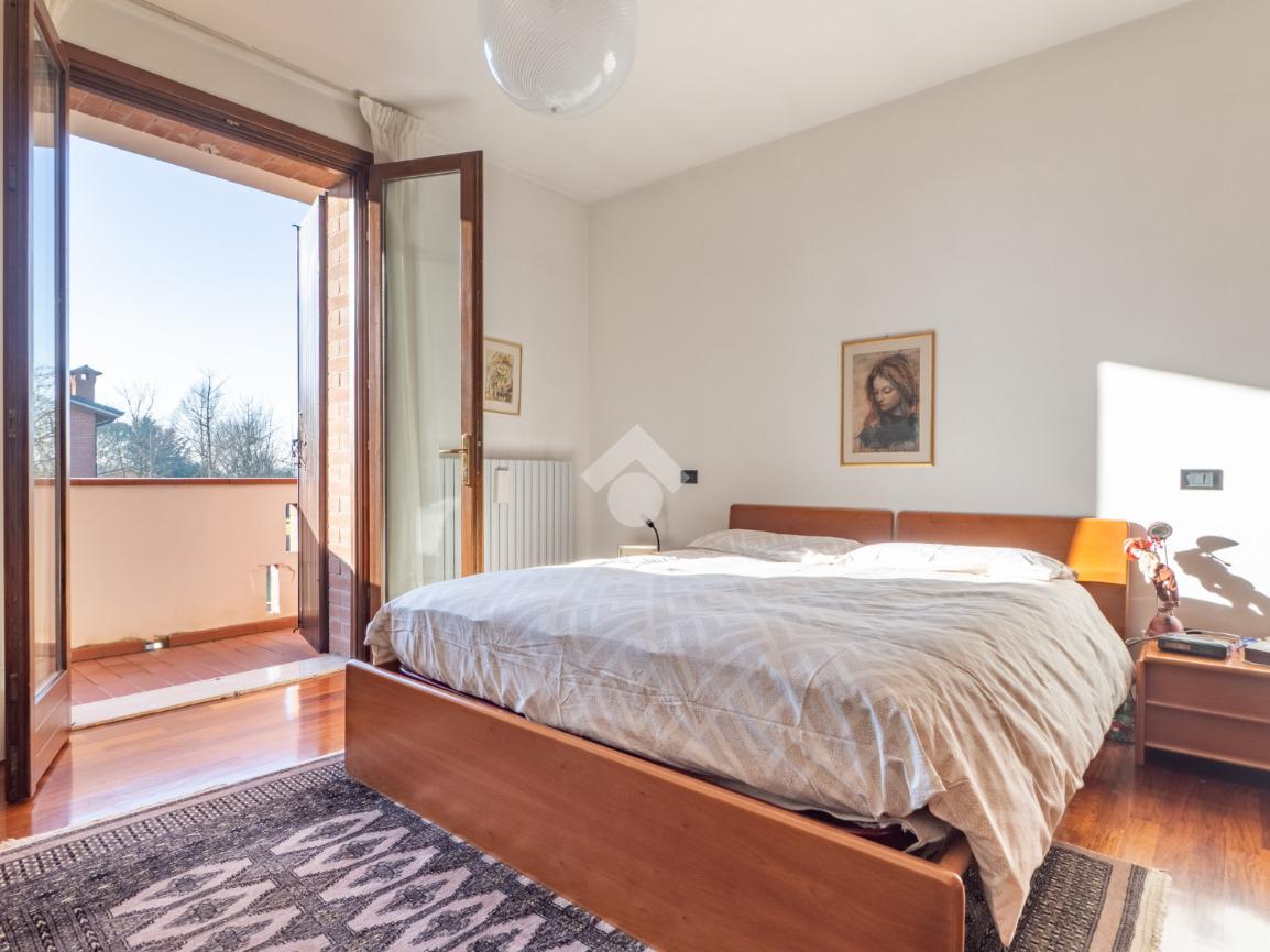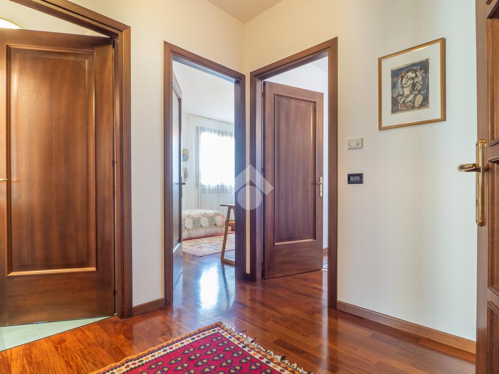 Prendendo le eleganti scale in legno, e separato da una raffinata porta a vetri che lascia filtrare la luce, si accede al grande disimpegno della zona notte, che ospita tre camere da letto e due grandi bagni finestrati: uno con doccia e uno con vasca idromassaggio. La camera padronale gode dell’accesso a un ampio balcone, mentre le altre due camere, oggi arredate come singole, offrono comunque metrature generose.
