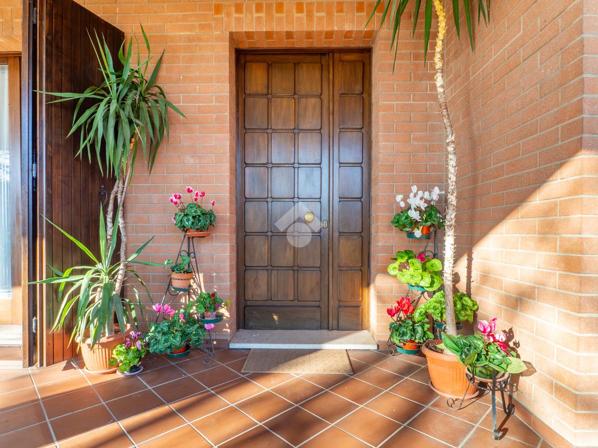 L’ingresso pedonale accompagna invece, attraverso una dolce scalinata esterna, al porticato e alla porta principale. All’interno si apre un ingresso elegante che conduce al grande e luminosissimo soggiorno, cuore della casa: due ampie vetrate lo mettono in diretto dialogo con il giardino, mentre gli spazi sono ben organizzati tra zona relax con camino in muratura e marmo e area pranzo affacciata sul verde.